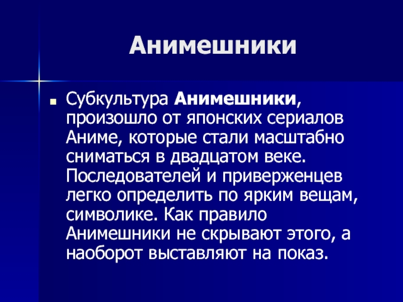Субкультура Анимешники, произошло от японских сериалов Аниме, которые стали масштабно сниматься в