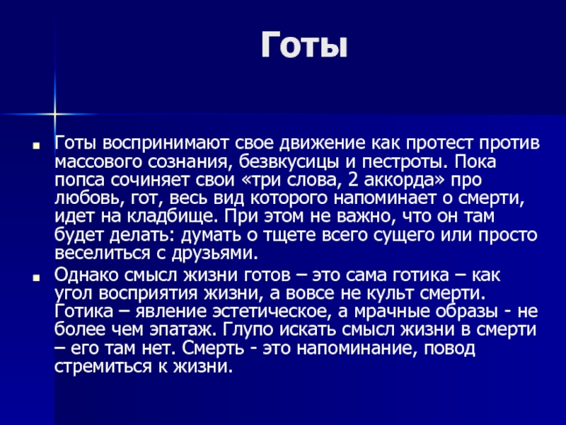 пестроты. Пока попса сочиняет свои «три слова, 2 аккорда» про любовь, гот, весь вид которого напоминает о смерти, идет на кладбище. При этом не важно, что он там будет делать: думать о тщете всего сущего или просто веселиться с друзьями.
