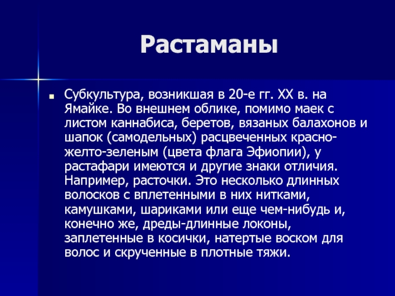 Субкультура, возникшая в 20-е гг. XX в. на Ямайке. Во внешнем