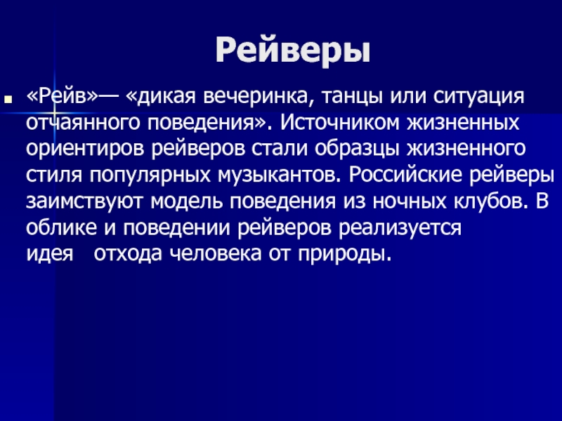 «Рейв»— «дикая вечеринка, танцы или ситуация отчаянного поведения». Источником жизненных ориентиров