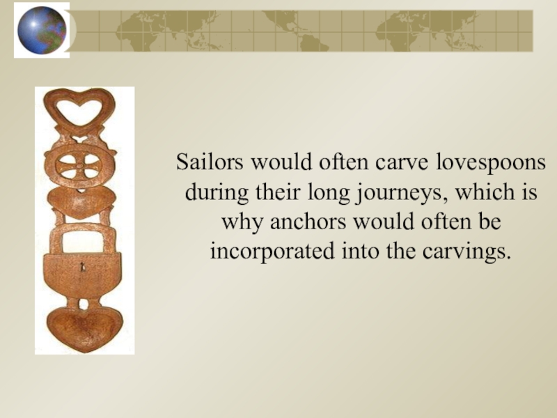 Слайд 5Sailors would often carve lovespoons during their long journeys, which is