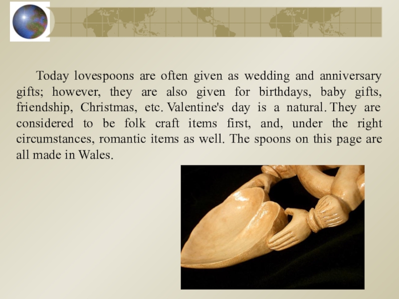Слайд 7Today lovespoons are often given as wedding and anniversary gifts; however,