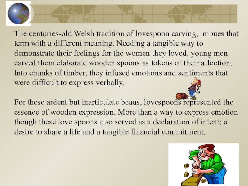 Слайд 6The centuries-old Welsh tradition of lovespoon carving, imbues that term with