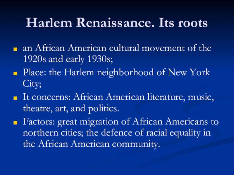 Harlem Renaissance. Its roots an African American cultural movement of the 1920s and early 1930s;Place: the Harlem neighborhood of New York City;It concerns: African American literature, music, theatre, art, and politics.Factors: great migration of African Americans