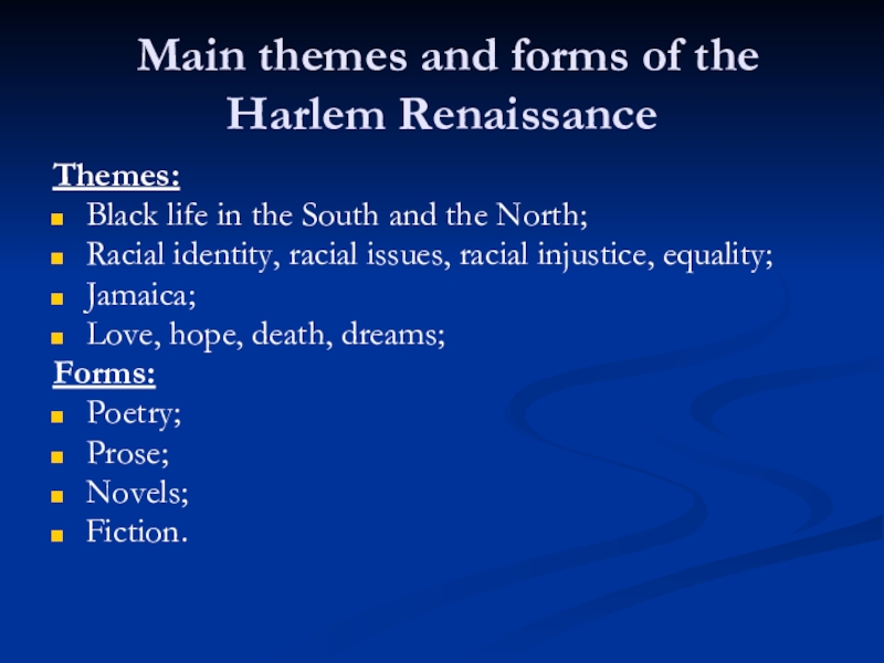 Слайд 4 Main themes and forms of the Harlem Renaissance
