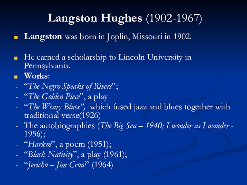 Langston Hughes (1902-1967)Langston was born in Joplin, Missouri in 1902. He earned a scholarship to Lincoln University