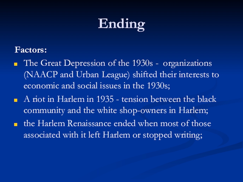 EndingFactors:The Great Depression of the 1930s - organizations (NAACP and Urban League) shifted their interests to economic
