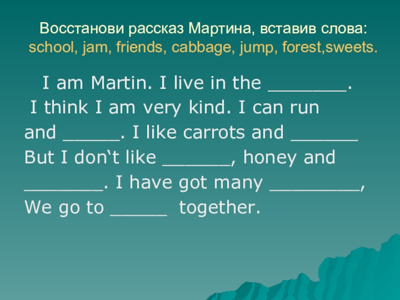 Слайд 8Восстанови рассказ Мартина, вставив слова: school, jam, friends, cabbage, jump, forest,sweets.