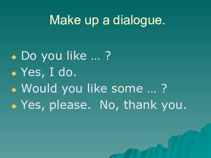 Make up a dialogue.Do you like … ?Yes, I do.Would you like some … ?Yes, please. No,