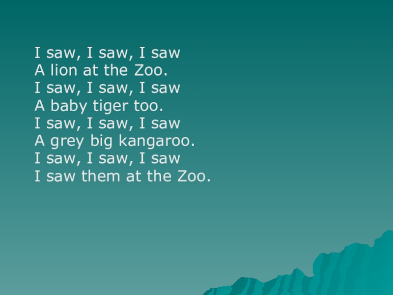 I saw, I saw, I saw A lion at the Zoo. I saw, I saw, I saw A baby tiger too. I saw, I saw, I saw A grey big kangaroo. I