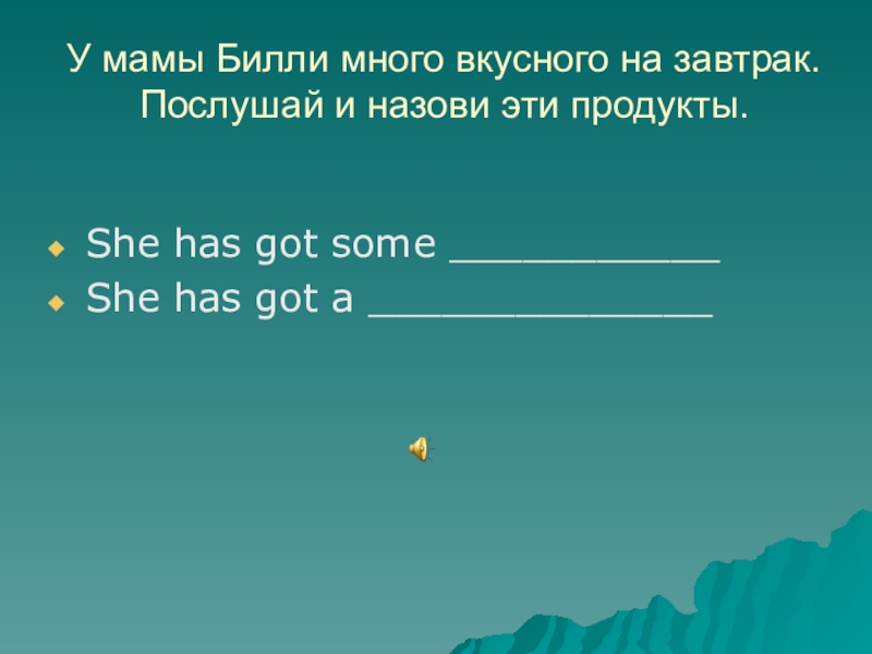 У мамы Билли много вкусного на завтрак. Послушай и назови эти продукты. She has got some ___________She