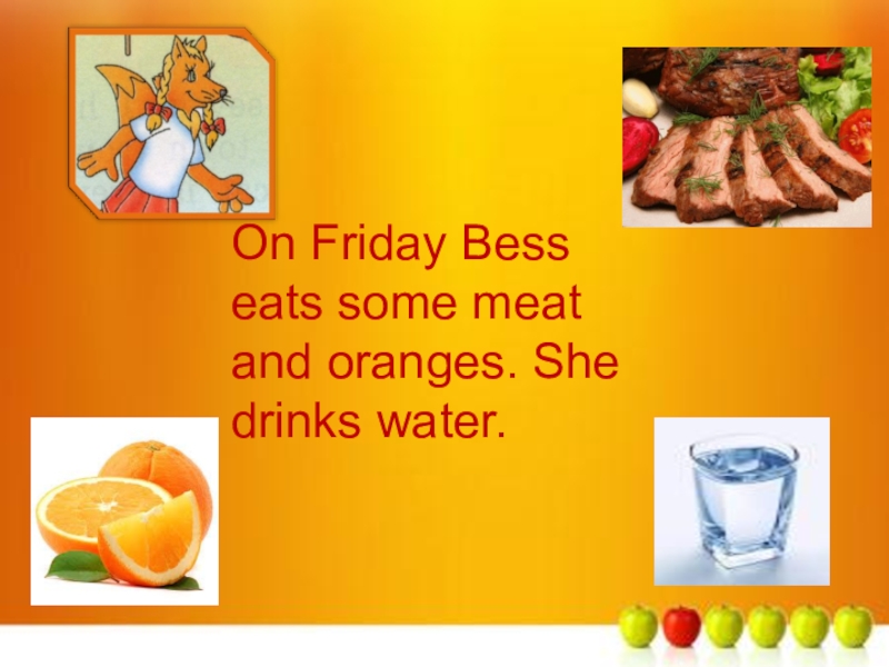 мOn Friday Bess eats some meat and oranges. She drinks water.