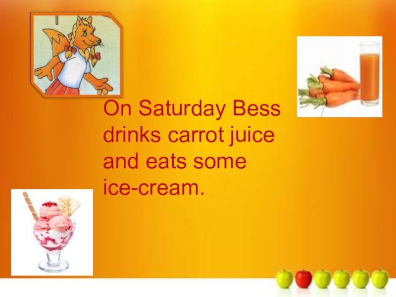 мOn Saturday Bess drinks carrot juice and eats some ice-cream.