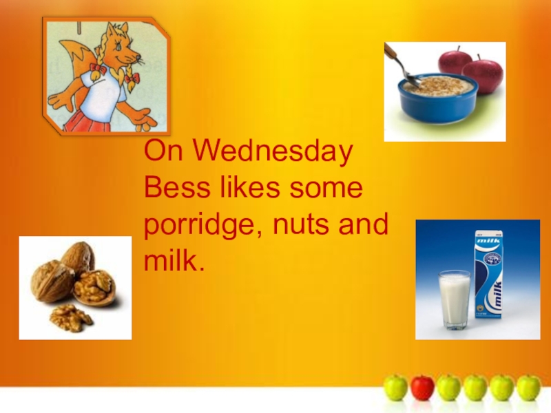 мOn Wednesday Bess likes some porridge, nuts and milk.
