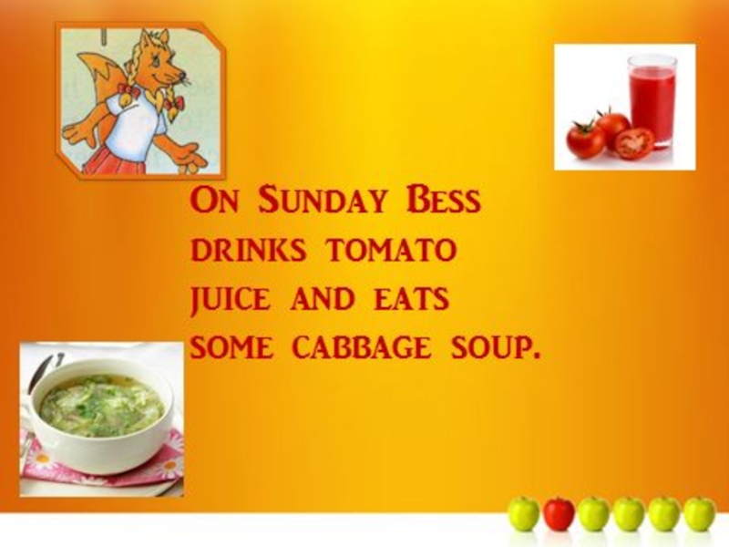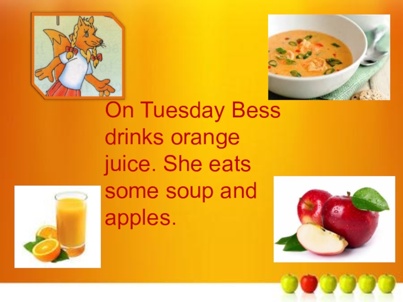 мOn Tuesday Bess drinks orange juice. She eats some soup and apples.