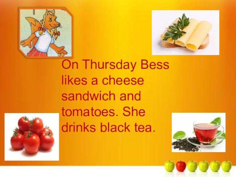 мOn Thursday Bess likes a cheese sandwich and tomatoes. She drinks black tea.