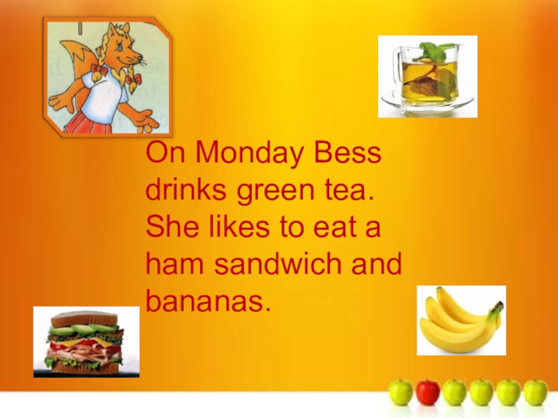мOn Monday Bess drinks green tea. She likes to eat a ham sandwich and bananas.