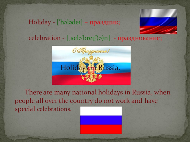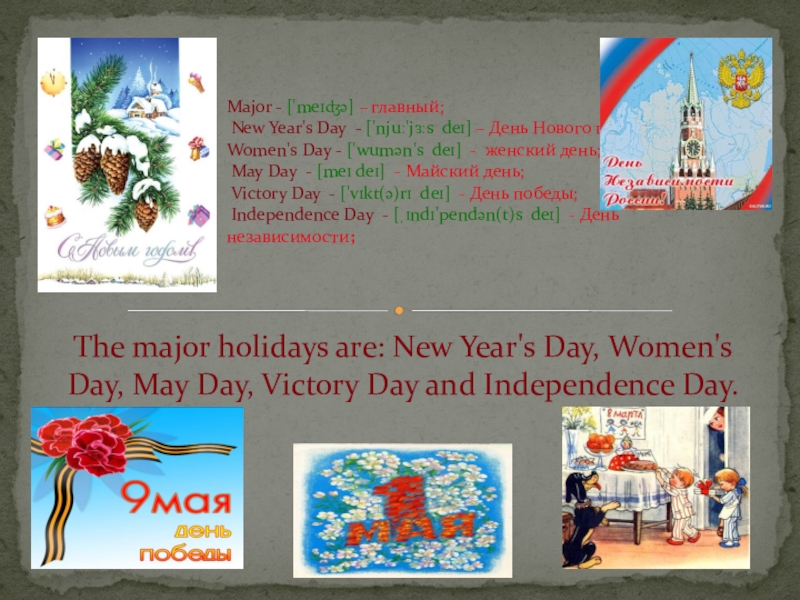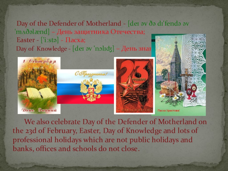 Day of the Defender of Motherland - [deɪ əv ðə dɪ'fendə əv 'mʌðəlænd] – День защитника Отечества;