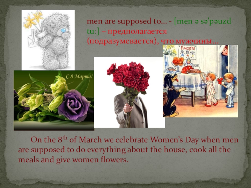 men are supposed to… - [men ə sə'pəuzd tuː] – предполагается (подразумевается), что мужчины…