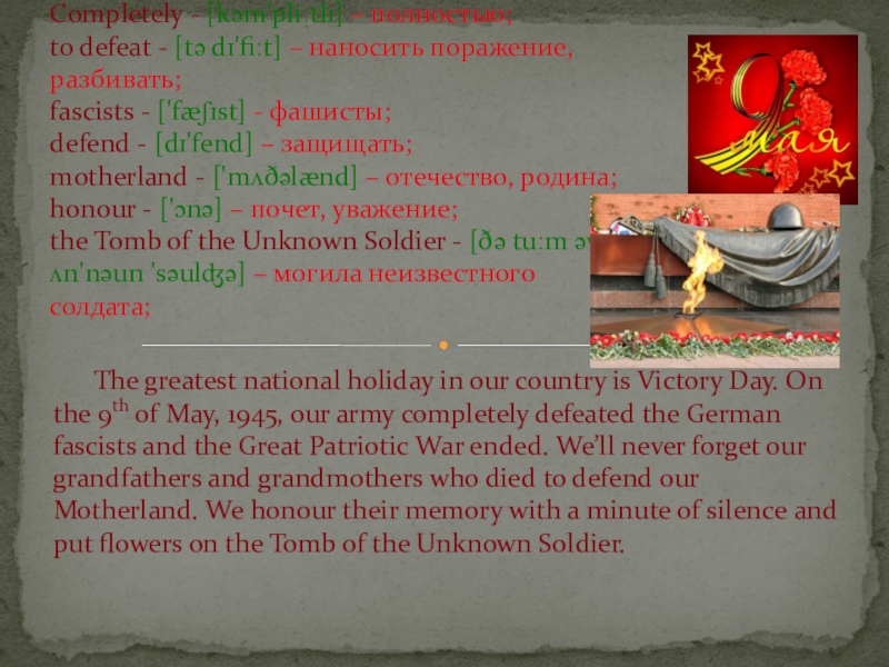 Victory Day - ['vɪkt(ə)rɪ deɪ] - День победы;