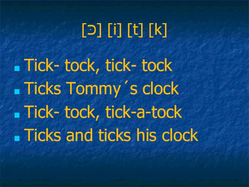 [כּ] [i] [t] [k] Tick- tock, tick- tockTicks Tommy´s clockTick- tock, tick-a-tockTicks and ticks his clock