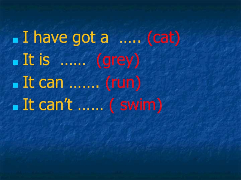 I have got a ….. (cat)It is …… (grey)It can ……. (run)It can’t …… ( swim)