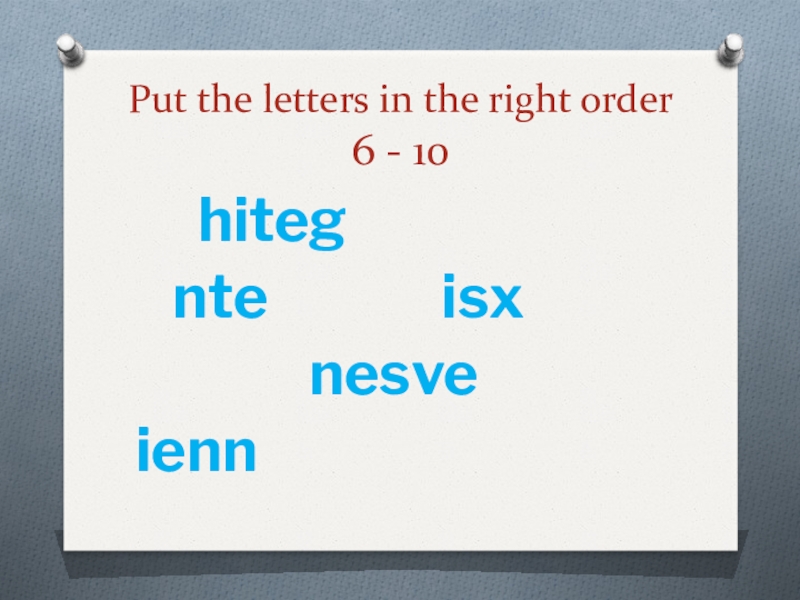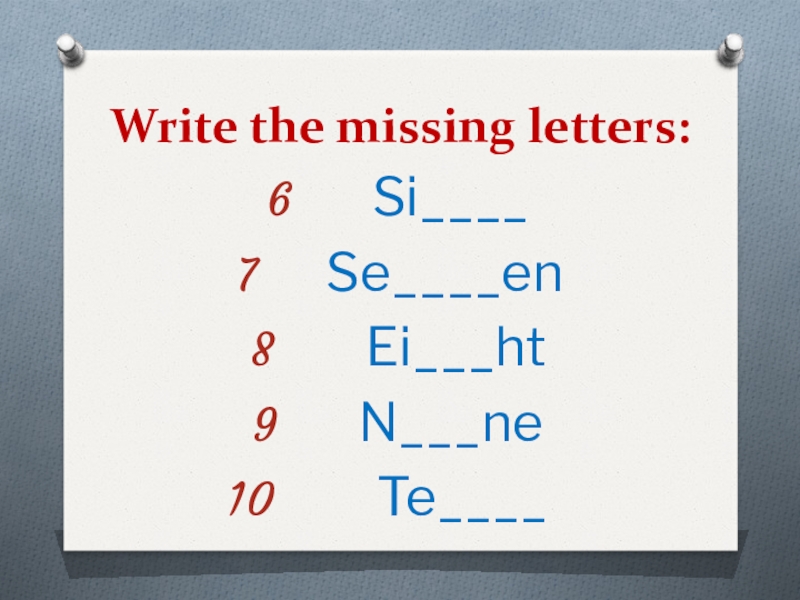 Write the missing letters: Si____ Se____en  Ei___ht N___ne  Te____