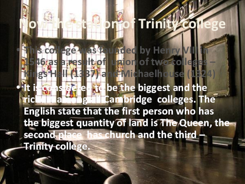 It is considered to be the biggest and the richest among all Cambridge colleges. The English state that the first person who has the biggest quantity of land is The Queen, the second place has church and the third – Trinity college.