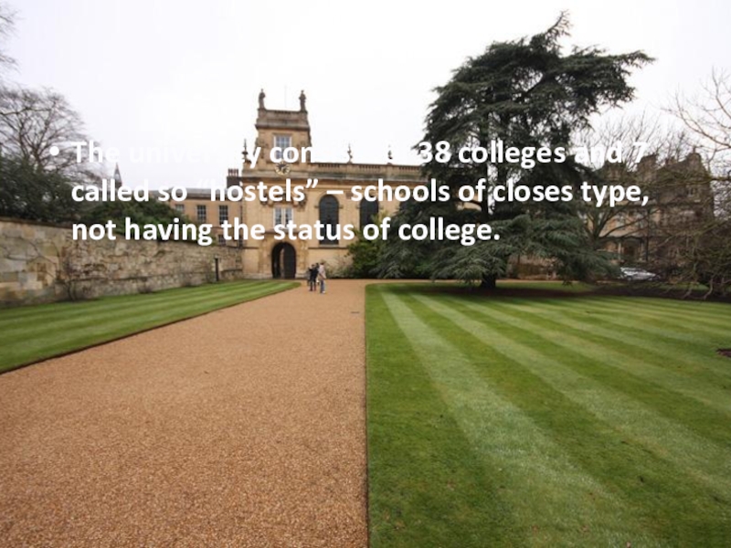 Слайд 23The university consists of 38 colleges and 7 called so “hostels”