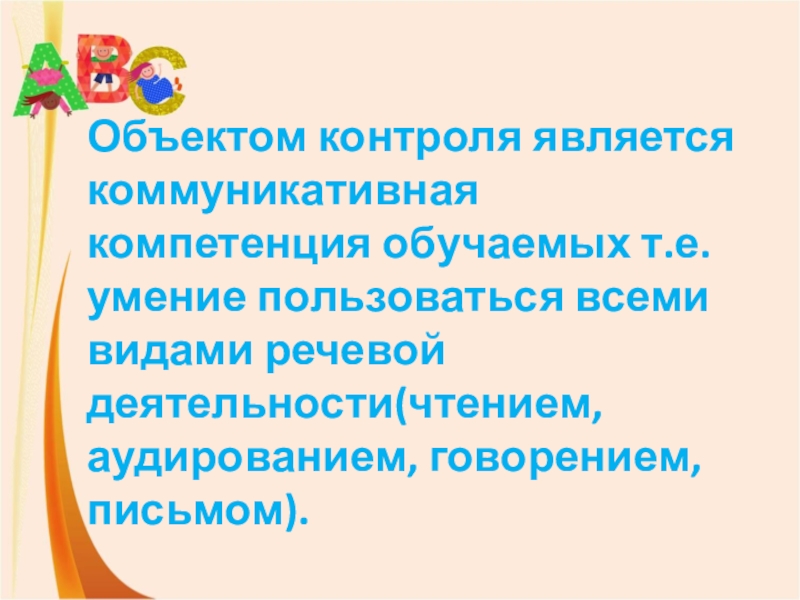 Слайд 5Объектом контроля является коммуникативная компетенция обучаемых т.е. умение пользоваться всеми видами