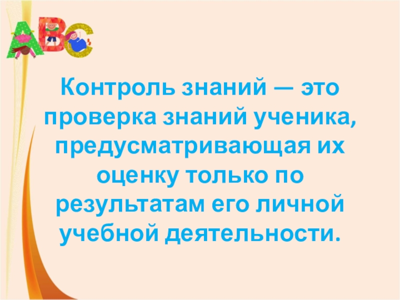 Слайд 4Контроль знаний — это проверка знаний ученика, предусматривающая их оценку только