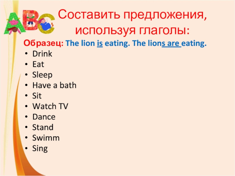 Образец: The lion is eating. The lions