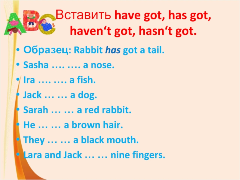 Слайд 21Вставить have got, has got, haven‘t got, hasn‘t got.
