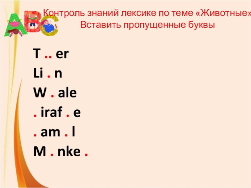 Слайд 22Контроль знаний лексике по теме «Животные»