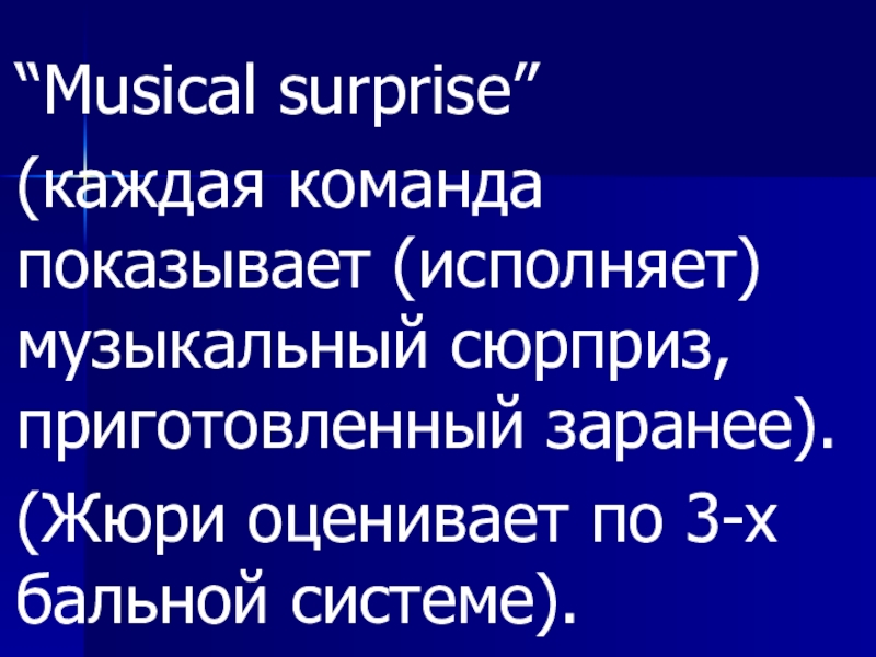 (каждая команда показывает (исполняет) музыкальный сюрприз, приготовленный заранее).