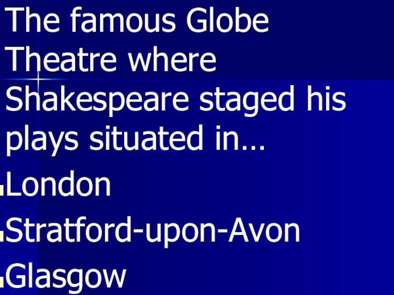 Слайд 16The famous Globe Theatre where Shakespeare staged his plays situated in…