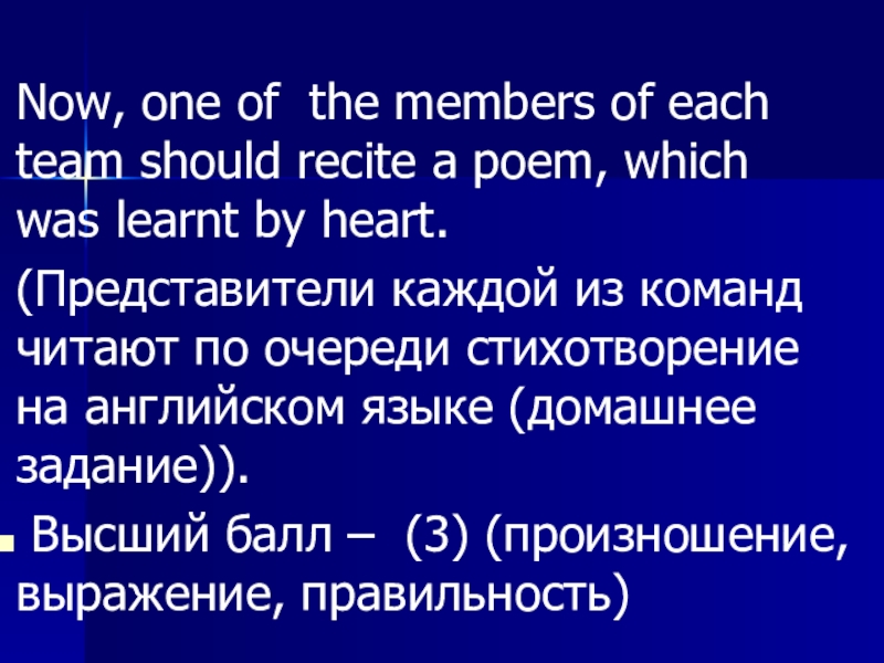 (Представители каждой из команд читают по очереди стихотворение на английском языке (домашнее задание)).