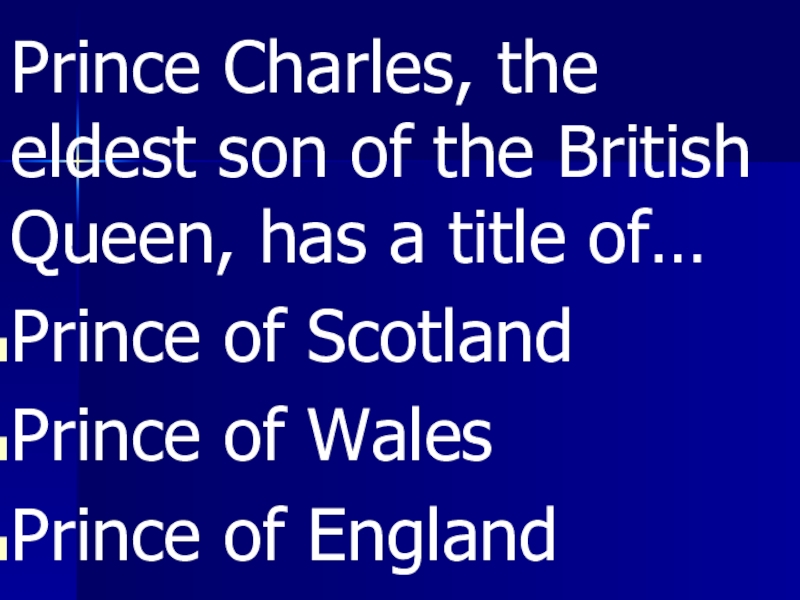 Слайд 17Prince Charles, the eldest son of the British Queen, has a