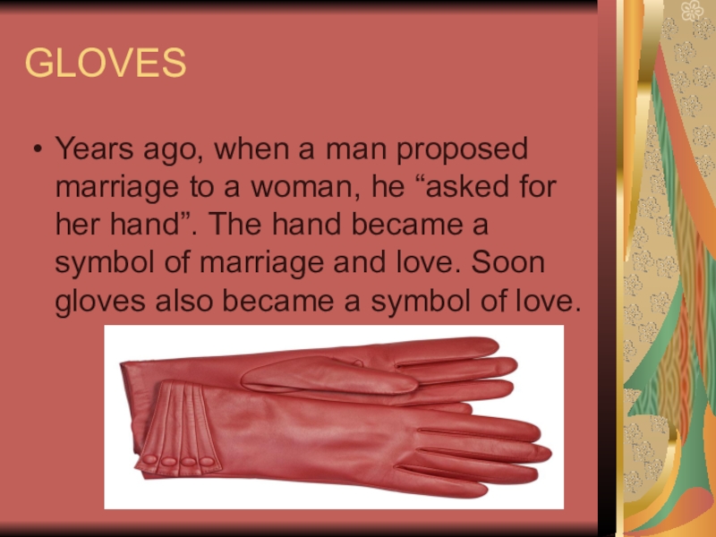 “asked for her hand”. The hand became a symbol of marriage and love. Soon gloves also became a symbol of love.