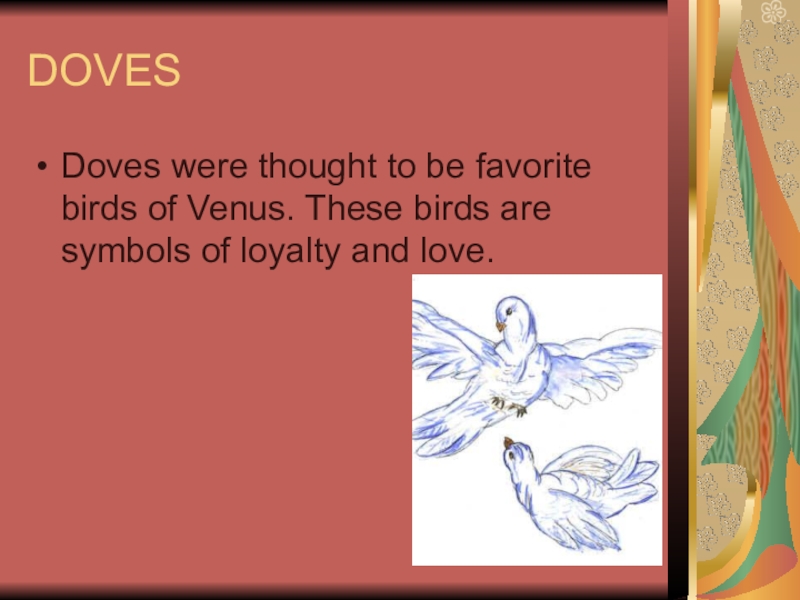 DOVESDoves were thought to be favorite birds of Venus. These birds are symbols of loyalty and love.