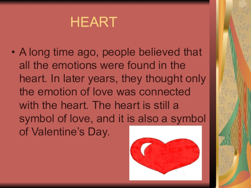 ago, people believed that all the emotions were found in the heart. In later years, they thought only the emotion of love was connected with the heart. The heart is still a symbol of love, and it is also a symbol of Valentine’s Day.
