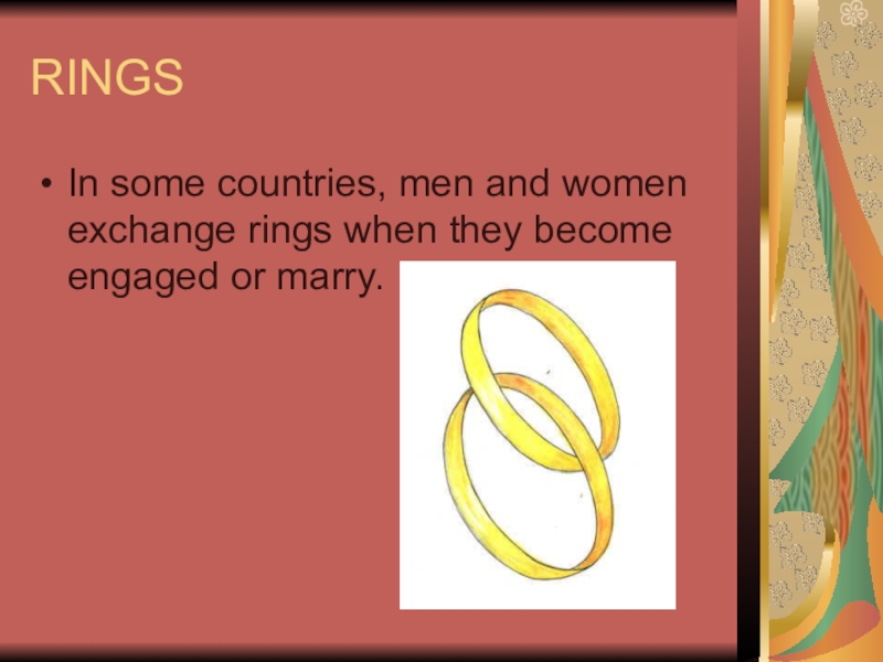 RINGSIn some countries, men and women exchange rings when they become engaged or marry.