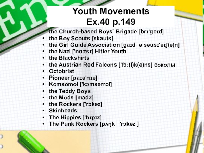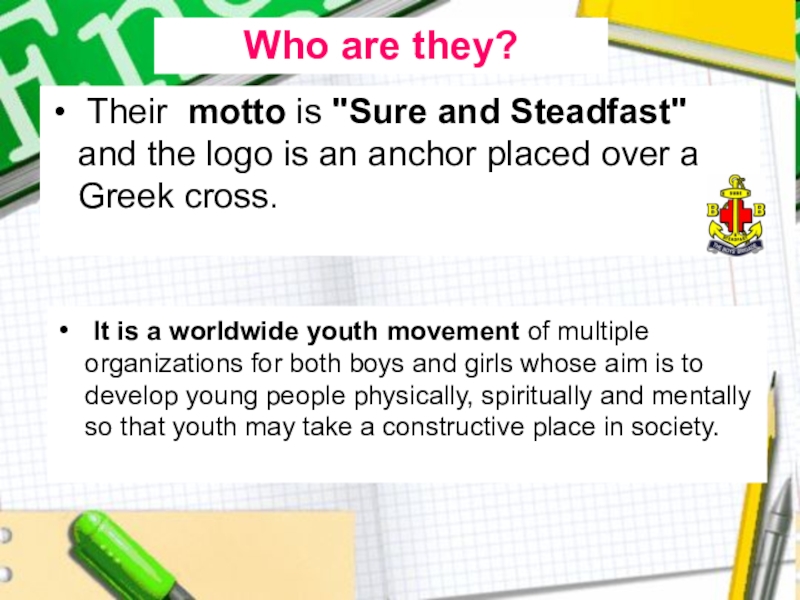 It is a worldwide youth movement of multiple organizations for both boys and girls whose aim is to develop young people physically, spiritually and mentally so that youth may take a constructive place in society.