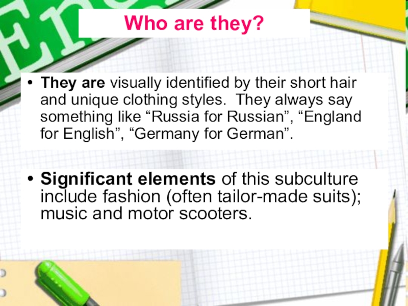 Significant elements of this subculture include fashion (often tailor-made suits); music and motor scooters.
