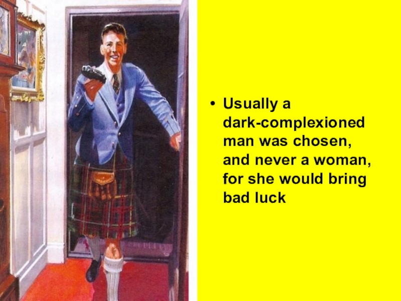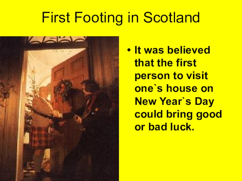 First Footing in ScotlandIt was believed that the first person to visit one`s house on New Year`s