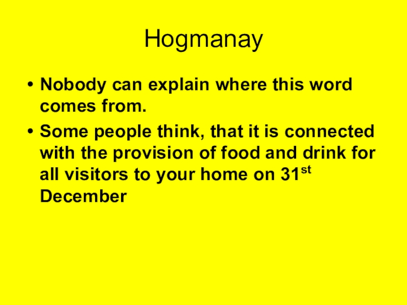 HogmanayNobody can explain where this word comes from.Some people think, that it is connected with the provision