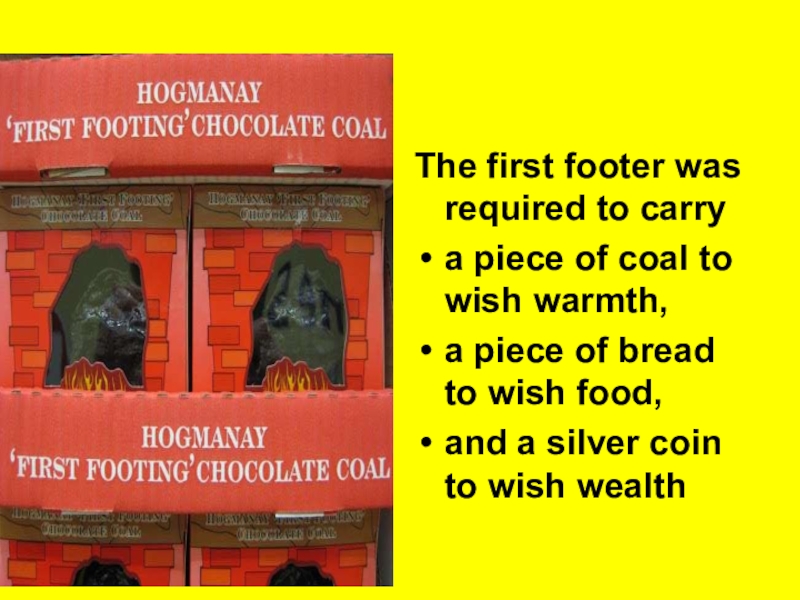 The first footer was required to carry a piece of coal to wish warmth, a piece of