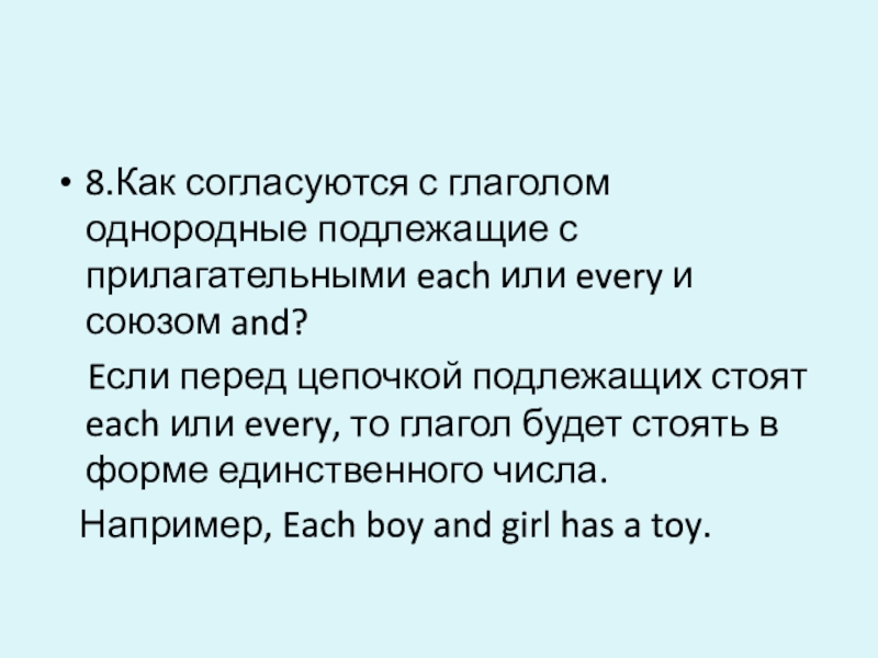 Слайд 98.Как согласуются с глаголом однородные подлежащие с прилагательными each или every