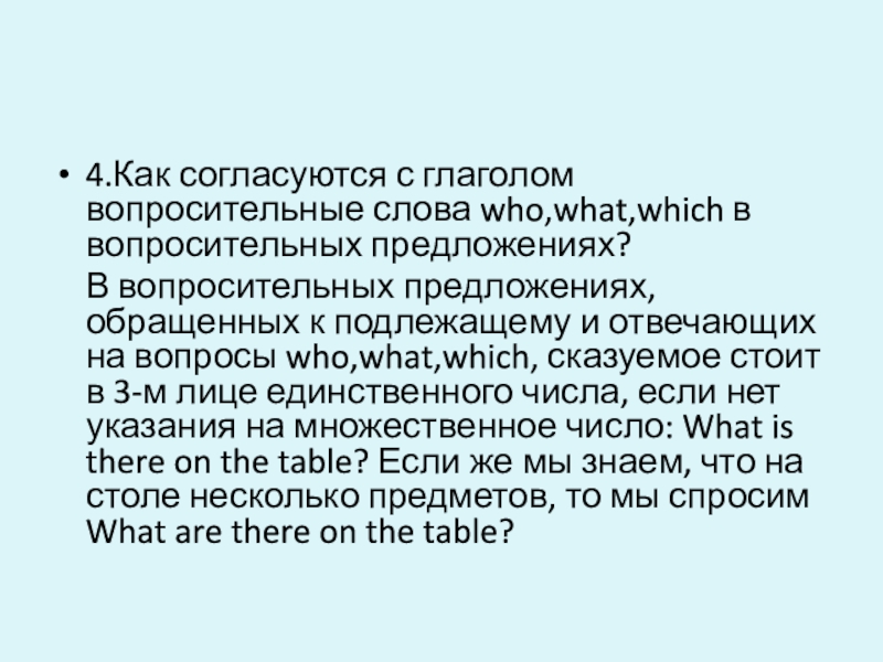 Слайд 54.Как согласуются с глаголом вопросительные слова who,what,which в вопросительных предложениях?