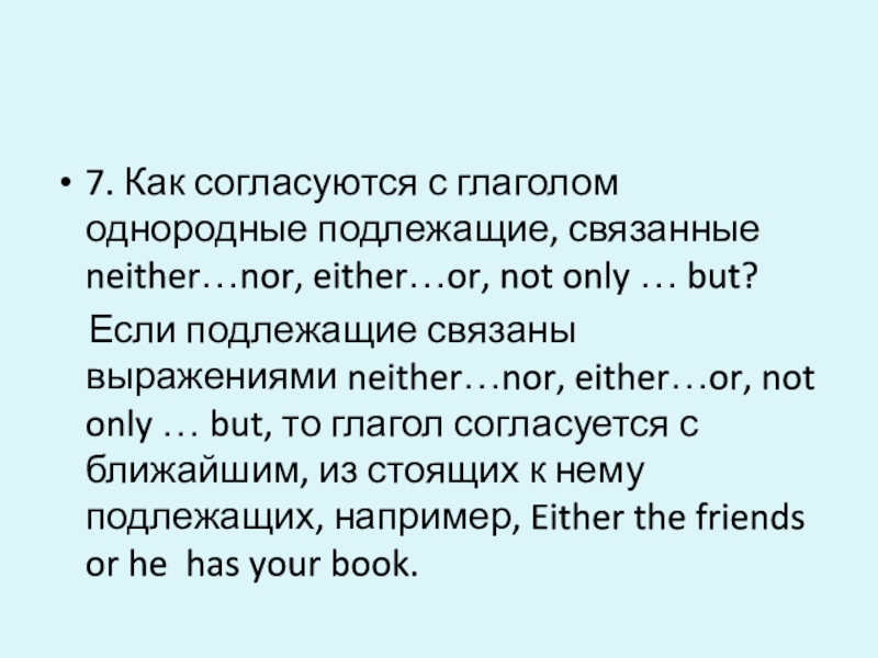 Если подлежащие связаны выражениями neither…nor, either…or, not only … but, то глагол согласуется с ближайшим, из стоящих к нему подлежащих, например, Either the friends or he has your book.
